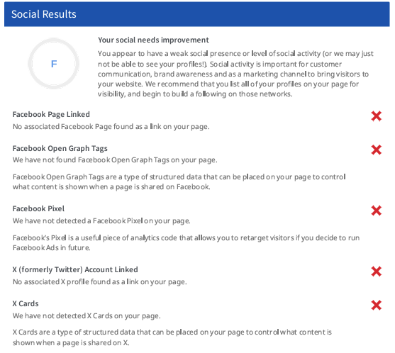Een website kan een A+ beoordeling voor Social behalen als het alle 5 sociale accounts heeft verbonden en de noodzakelijke metadata is opgenomen in de paginakop.