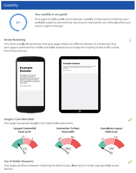 Een website kan een A+ beoordeling voor Bruikbaarheid behalen als deze optimaal weergeeft op alle apparaten, een Favicon gebruikt en geen Flash of iFrames bevat.
