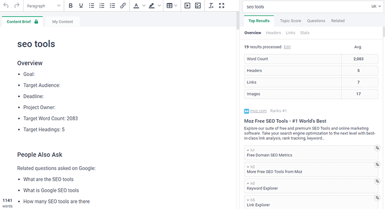 Richard deelde het voorbeeld (hierboven) waar hij een artikel heeft gemaakt met de titel "SEO tools" en Frase heeft automatisch een woordenaantal, koppen, links en afbeeldingen voorgesteld om optimaal te concurreren met de andere resultaten voor deze zoekwoordzin.