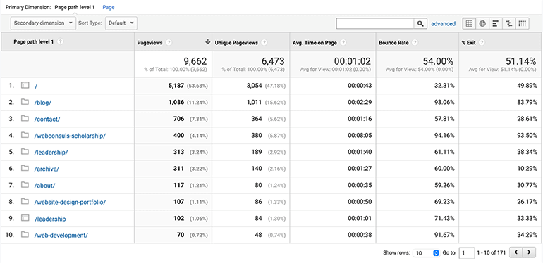 Sommige pagina's zullen niet van toepassing zijn, en dat is waar het logische aspect om de hoek komt kijken. Bijvoorbeeld, sommige pagina's met een relatief hoog bouncepercentage hebben formulierinzendingsacties op de pagina, dus het bouncepercentage is niet zo'n grote overweging als het op andere pagina's zou zijn.