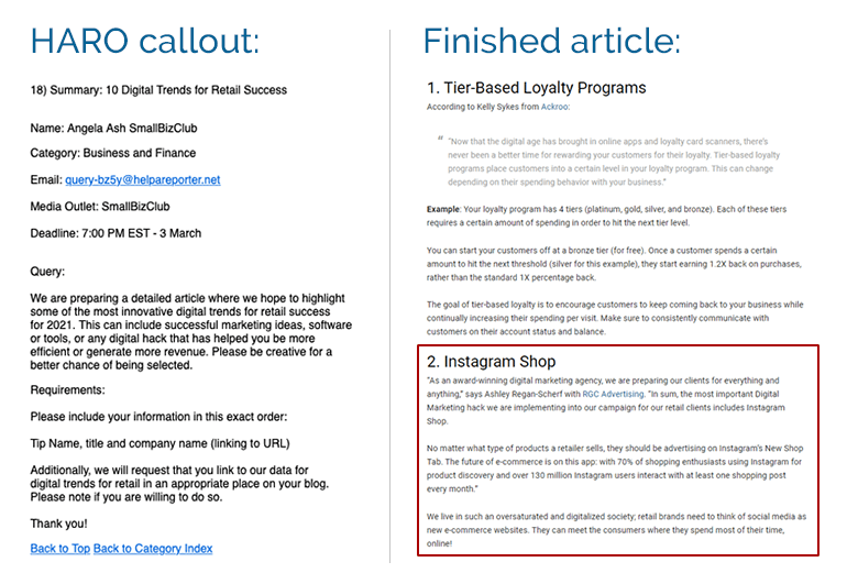 Ashley deelde hierboven een voorbeeld met mij waar ze reageerde op een oproep van SmallBizClub. Haar geweldige inzending werd vervolgens geaccepteerd en gepubliceerd in hun definitieve artikel getiteld '13 Digital Trends for Retail Success'.