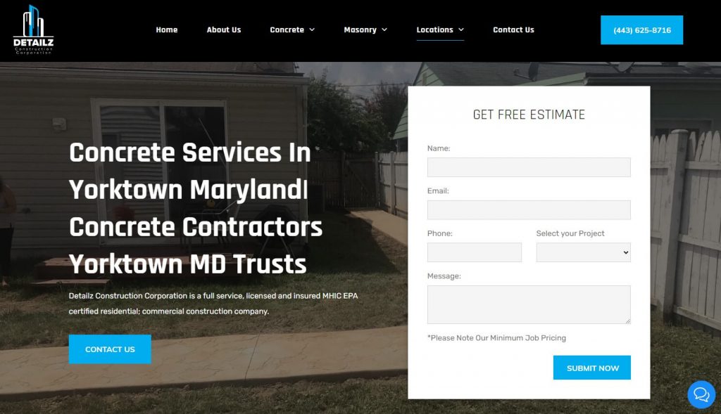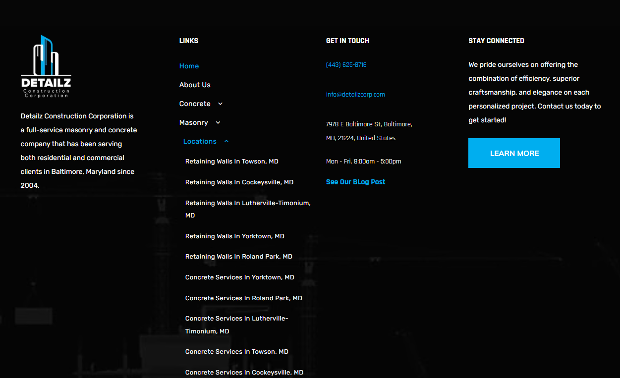Hier is een voorbeeld van alle locatiepagina's vermeld in de voettekst van de website van Detailz Construction Corporation: