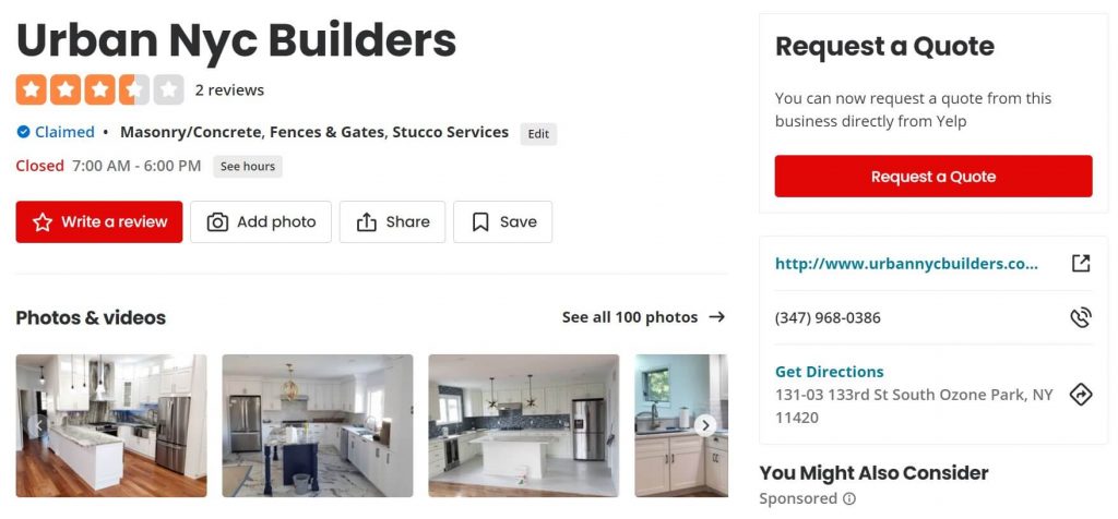 Hier is een voorbeeld van een volledige online vermelding verstrekt door Urban Nyc Builders Inc. die de bedrijfsnaam, telefoon, adres, lijst van diensten en website toont: