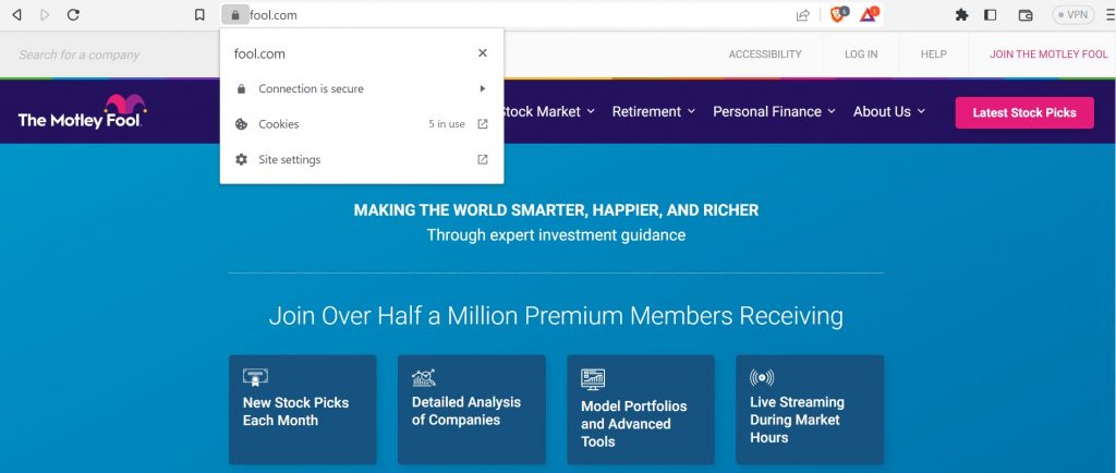 Hier is een voorbeeld van een financiële website, Fool.com die een geldig SSL-certificaat op zijn domein gebruikt om de gebruikersgegevens veilig te houden.