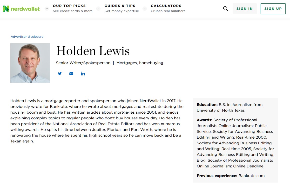 Bijvoorbeeld, NerdWallet toont de achtergrond en kwalificaties van hun schrijver in elk artikel om hun kennis en ervaring aan te tonen.