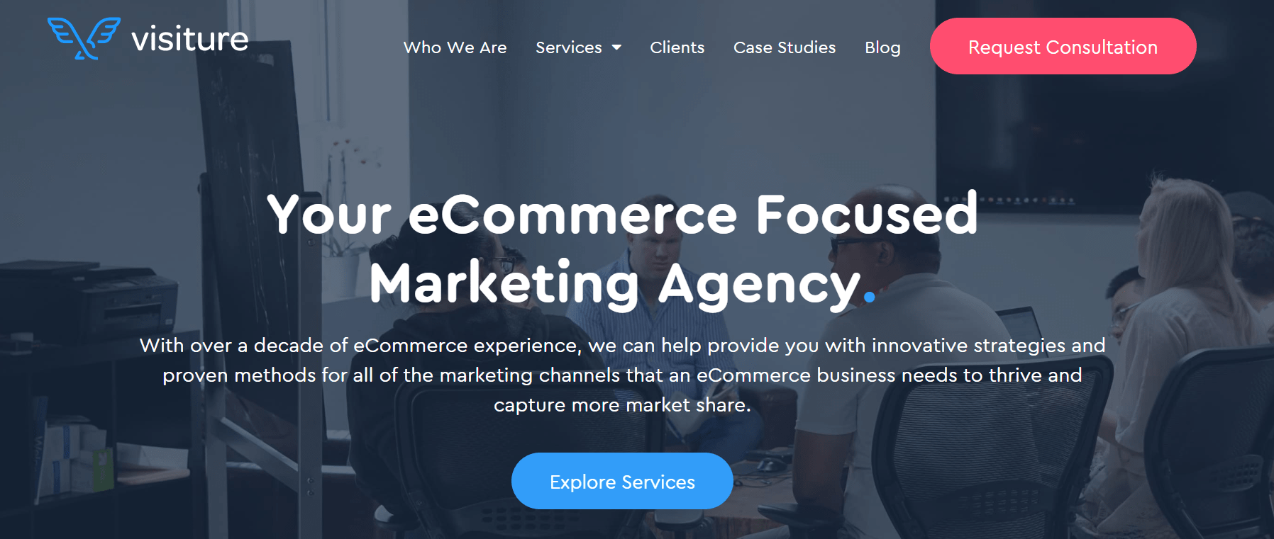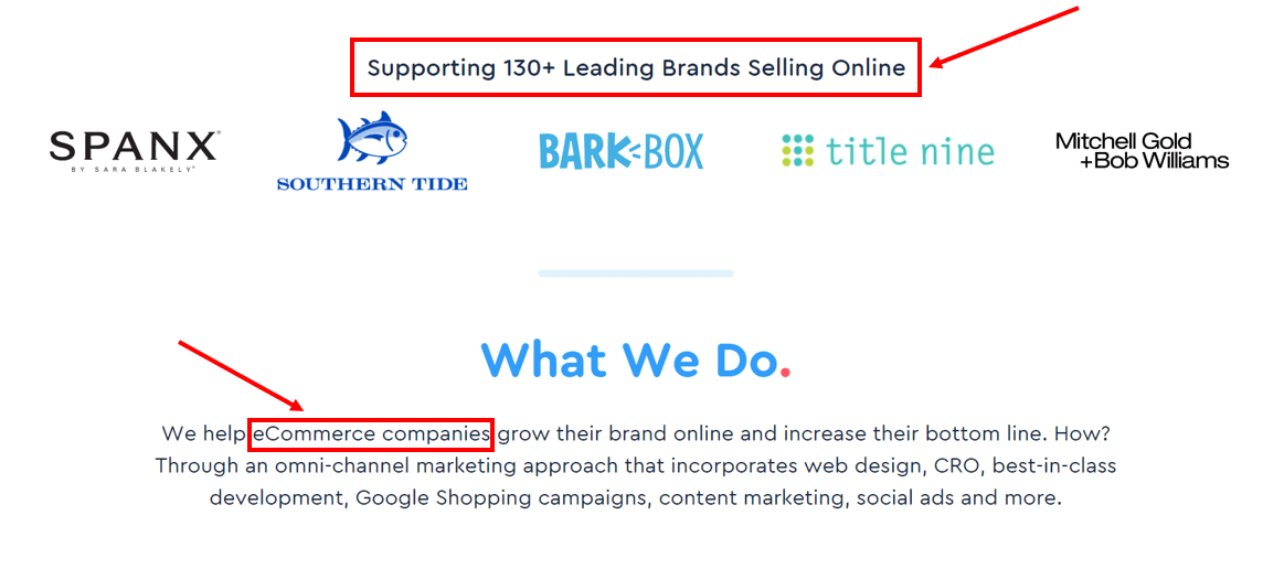 Dit bureau toont de winkels waarmee ze hebben samengewerkt en ze vermelden ook specifiek dat ze eCommerce bedrijven helpen om hun merk te “laten groeien” en hun “winst te verhogen”: