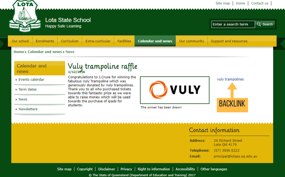 Een goed voorbeeld van een bedrijf dat dit goed doet, is de trampolinefabrikant en -leverancier Vuly Play. De Australische tak van hun bedrijf zorgt voor regelmatige links naar hun Australische domein door trampolines te doneren aan scholen en liefdadigheidsinstellingen in de lokale omgeving—zie enkele van de artikelenhier, hier en hier.
