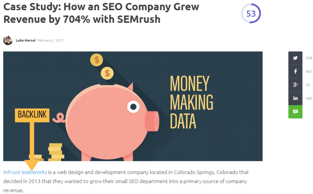 De waarde-uitwisseling in dit backlinkvoorbeeld is jouw content voor een link—meestal gehyperlinkt binnen je naam of bedrijfsnaam. Als alternatief kan de backlink worden geplaatst in een opener of closer, of ergens dat natuurlijk vloeit binnen het artikel.