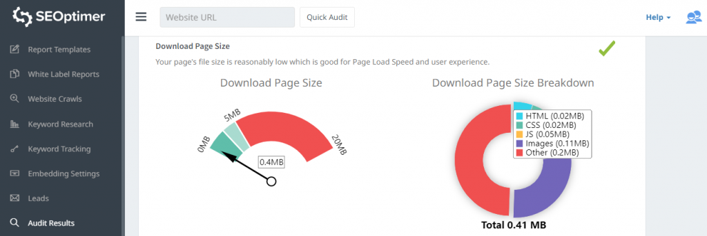 Wanneer je je site beoordeelt met SEOptimer, kun je eenvoudig de totale paginagrootte van je website identificeren.
