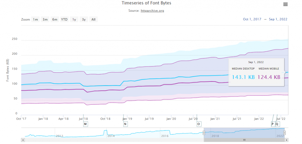 Vanaf september 2022 zijn lettertypen goed voor ongeveer 143 Kb en 124 Kb van de grootte van de webpagina op respectievelijk desktop- en mobiele apparaten.