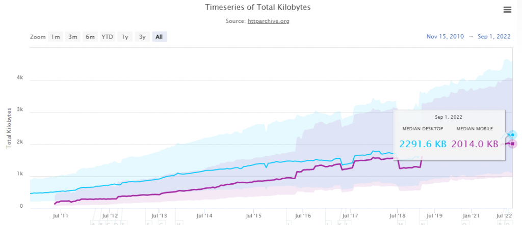 Fast forward naar september 2022, de gemiddelde webpagina grootte is ongeveer 2,2 MB voor desktop sites en 2 MB voor mobiele sites.