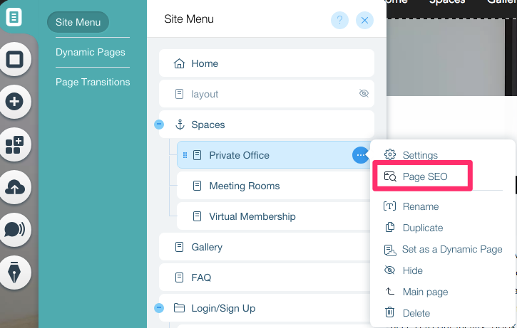 Om de titel tag op je Wix.com site te wijzigen, moet je naar Site Menu > Zoek de pagina > Meer opties (voor die specifieke pagina) > Pagina SEO: