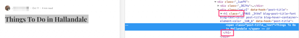 Als je je titel markeert en klikt op Inspect Element, zul je merken dat de titel van het artikel <h1> is: