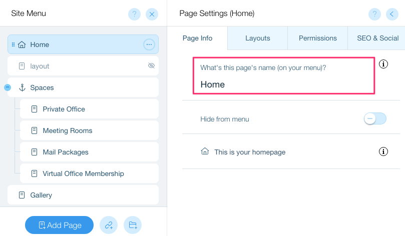 - Zorg ervoor dat je paginanaam anders is dan je SEO-titeltag op Wix zoals besproken in onze title tag guide: