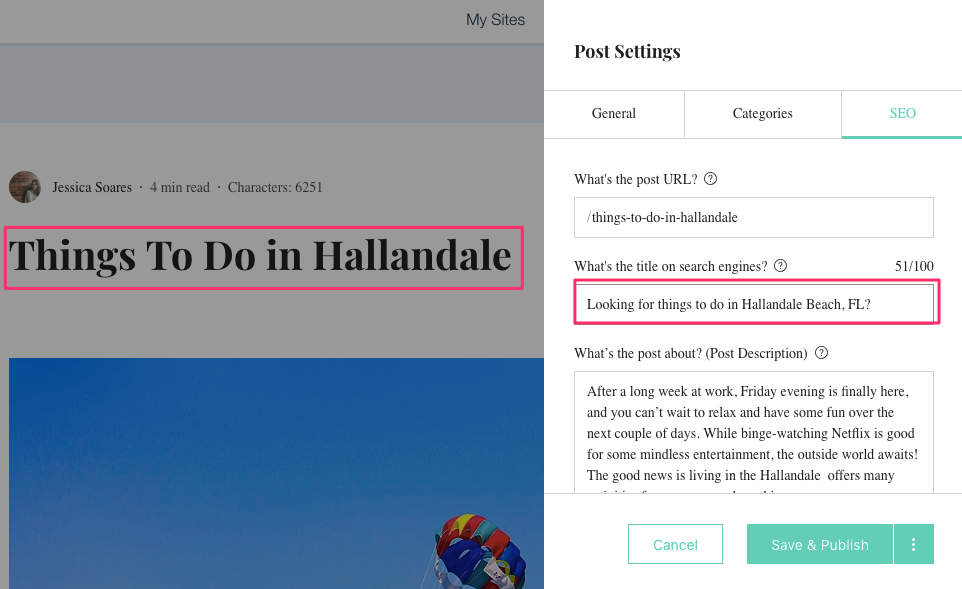 Met het bovenstaande voorbeeld is de titel van het artikel “Dingen om te doen in Hallandale” terwijl deze titel een goede is, is onze title tag geschreven als “Op zoek naar dingen om te doen in Hallandale Beach, FL?”