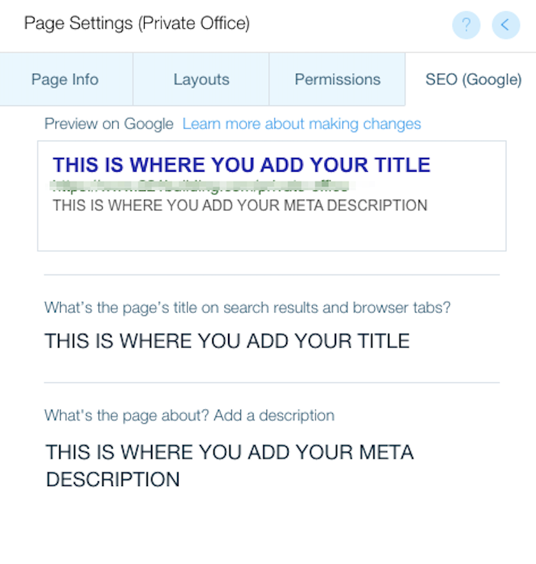 Je wordt doorgestuurd naar het SEO (Google) gedeelte van de Pagina-instellingen waar je je titel tag kunt invoeren in het eerste invoerveld dat is gelabeld “Wat is de titel van de pagina in zoekresultaten en browsertabs?”.