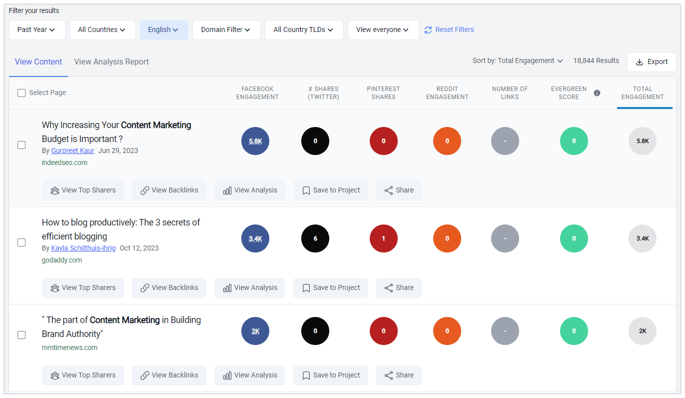Zoals je kunt zien, vermeldt BuzzSumo talloze trending, veel gedeelde artikelen met betrekking tot het onderwerp "content marketing."