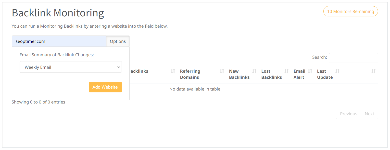 Nu je een idee hebt van wat er aan de hand is met je backlinkprofiel, kun je naar de sectie Backlink Monitoring navigeren. Zoals de naam al doet vermoeden, houdt deze tool je backlinkprofiel in de gaten en laat je zien of je backlinks hebt gewonnen of verloren.
