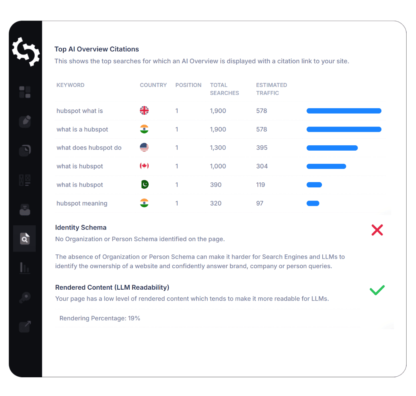 Volg vermeldingen en verkeer van AI Overviews en controleer belangrijke elementen zoals LLM Leesbaarheid, uw LLMs.txt-bestand en belangrijke schema's waarop LLMs vertrouwen om uw inhoud te interpreteren.