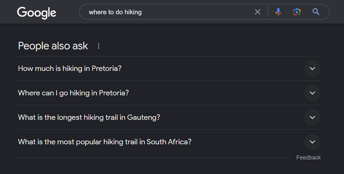 Oto przykład okienka Ludzie Pytają (PAA) dla zapytania “Gdzie się wybrać na piesze wędrówki?”