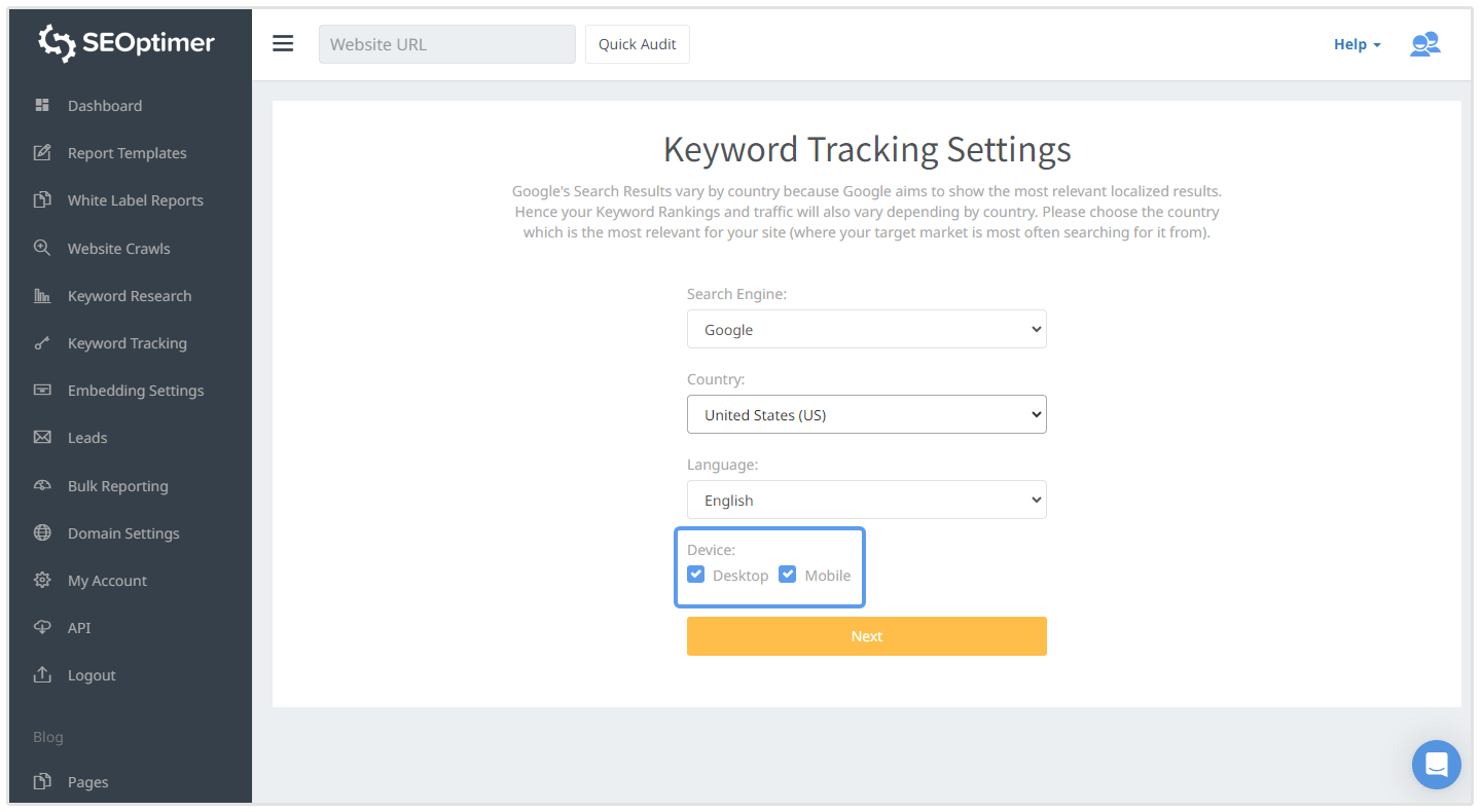 Na przykład, z narzędziem do śledzenia rankingu agencji SEOptimer, możesz śledzić rankingi w Google i Bing zarówno dla urządzeń mobilnych, jak i stacjonarnych (w ponad 70 krajach). To pozwala "cyfrowym marketerom" analizować pozycje słów kluczowych, "wolumeny wyszukiwań" i "informacje o konkurencji".
