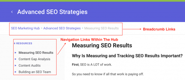 W swoim centrum marketingu SEO, Brian Dean użył nawet wyraźnie słowa "hub" w strukturze jego URL. A szprychy są dalej rozgałęzione pod nim.