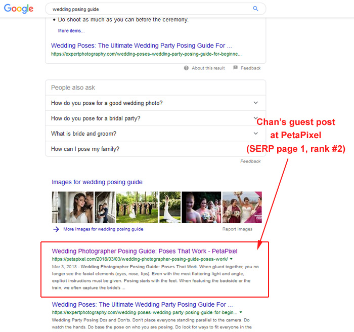 Przeprowadzając wyszukiwanie w Google, jego gościnny post na popularnym serwisie fotograficznym PetaPixel znajduje się na 1. stronie i przyciąga dużo ruchu zarówno dla PetaPixel, jak i strony internetowej Jimmy'ego (poprzez ruch odsyłający).