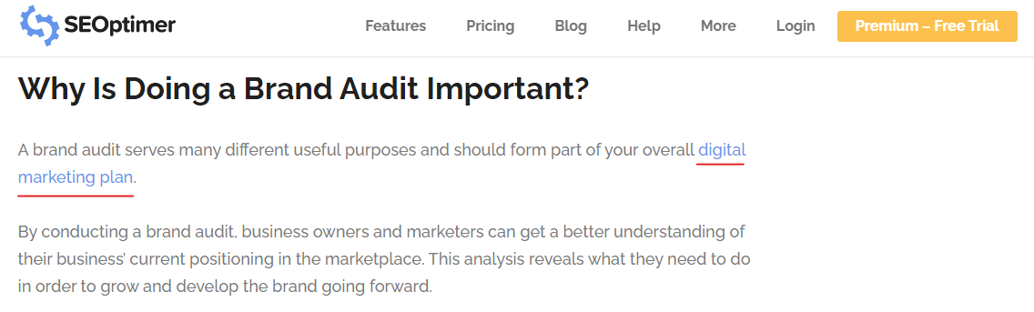 Przyjrzyjmy się temu. Więc jako nasz pierwszy przykład głębokiego linkowania dla SEO, wspomnieliśmy, że audyt marki jest częścią planu marketingu cyfrowego.