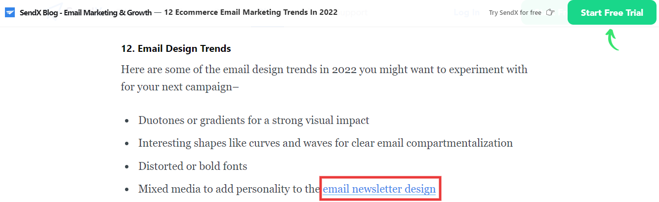 Ostatni przykład deep linking dla SEO, który chcielibyśmy przedstawić, można znaleźć w artykule na blogu Sendx. Artykuł omawia 12 różnych trendów w email marketingu eCommerce w 2022 roku.