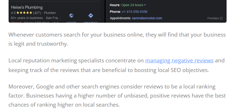 Oto przykład tego w działaniu, Local Ranking opublikował artykuł ukierunkowany na „koncepty zarządzania opiniami w Google”. Chociaż celowali w dokładnie to wyrażenie kluczowe, użyli „zarządzanie negatywnymi opiniami” jako tekst kotwicy w ich artykule o lokalnym marketingu reputacji.