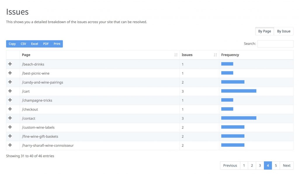 Narzędzie przeprowadzi pełne przeszukiwanie witryny i pokaże Ci strony, które mają najbardziej krytyczne problemy lub najwięcej problemów, abyś mógł skupić się na nich na początek. SEOptimer ma wyższy limit stron (300 stron) w porównaniu z GoDaddy, gdzie musisz pracować nad poszczególnymi witrynami i nie jest dostępne przeszukiwanie. Możesz filtrować wyniki na podstawie kategorii problemów, które chcesz rozwiązać jako pierwsze lub strona po stronie.