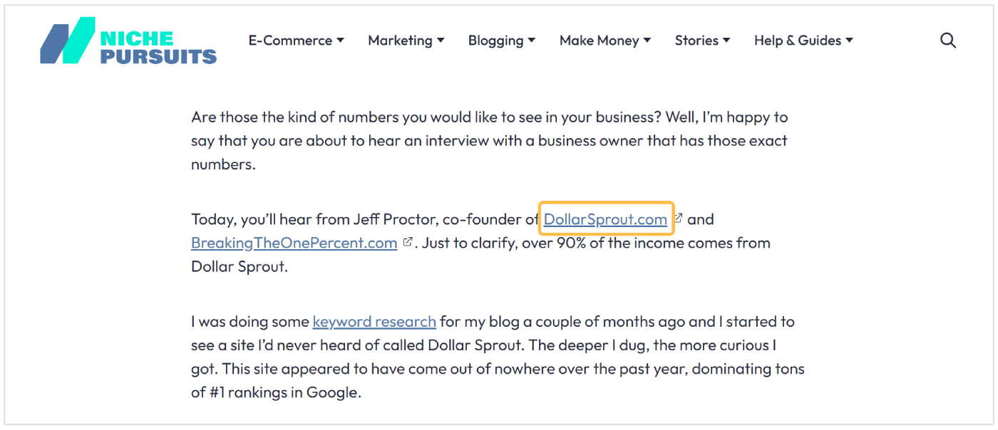 Oto wywiad z założycielem firmy, DollarSprout, na innej stronie. Pierwsze wspomnienie DollarSprout jest połączone z kontekstowym linkiem zwrotnym:
