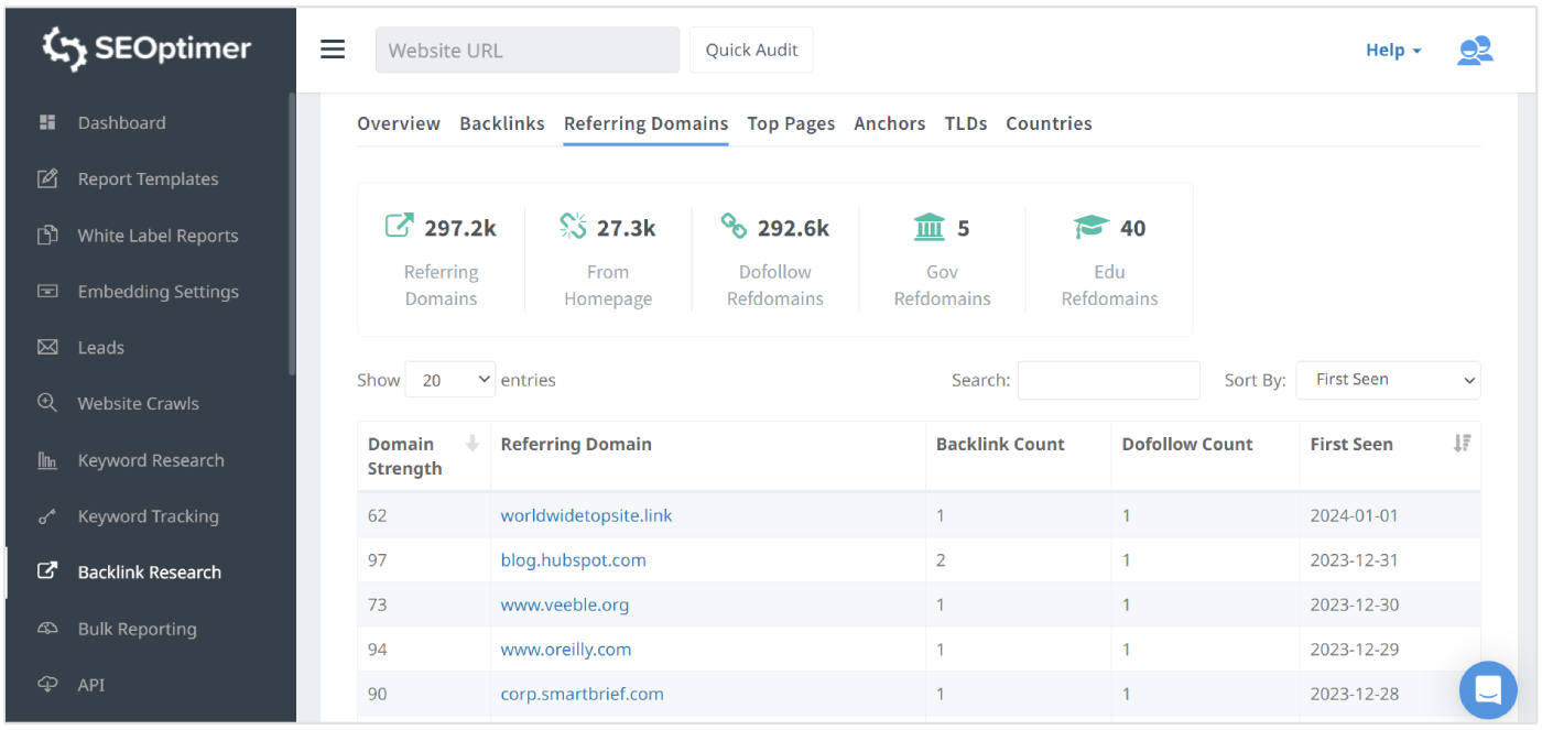 W swoim panelu SEOptimer przejdź do zakładki „Badanie Backlinków”, aby zobaczyć, jakie backlinki otrzymujesz, skąd one pochodzą i które strony są linkowane.