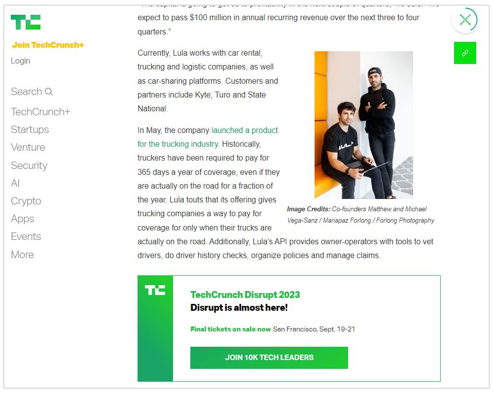 Na przykład, strona usługi ubezpieczenia ciężarówek Lula (wyróżniona na zielono poniżej) jest linkowana przez Techcrunch, który ma ogromny ruch przekraczający siedem milionów. Ten backlink z pewnością pomógł Lula zdobyć ruch odsyłający z Techcrunch.