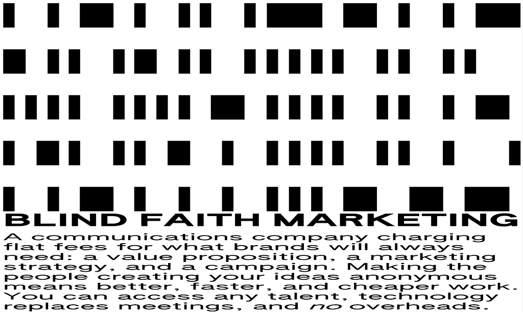 "Marketing na Ślepo. Anonimowa agencja reklamowa na czas spowolnienia, tworząca lepsze, szybsze i tańsze prace. Anonimowość osób tworzących twoje działania marketingowe oznacza lepszą, szybszą i tańszą pracę. Dostęp do dowolnego talentu, technologia zastępuje spotkania i brak kosztów stałych."