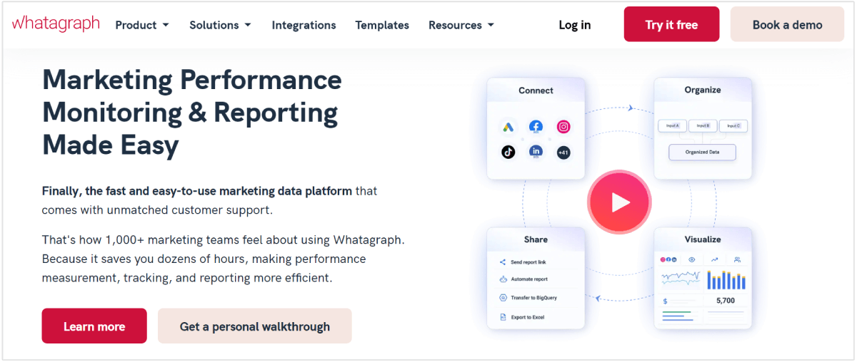 Whatagraph to platforma do analizy danych marketingowych z możliwością rebrandingu, która pomaga firmom [monitorować] i [raportować] ogólną [wydajność], umożliwiając zespołom [integrację] wszystkich danych marketingowych z różnych kanałów w jednym miejscu.