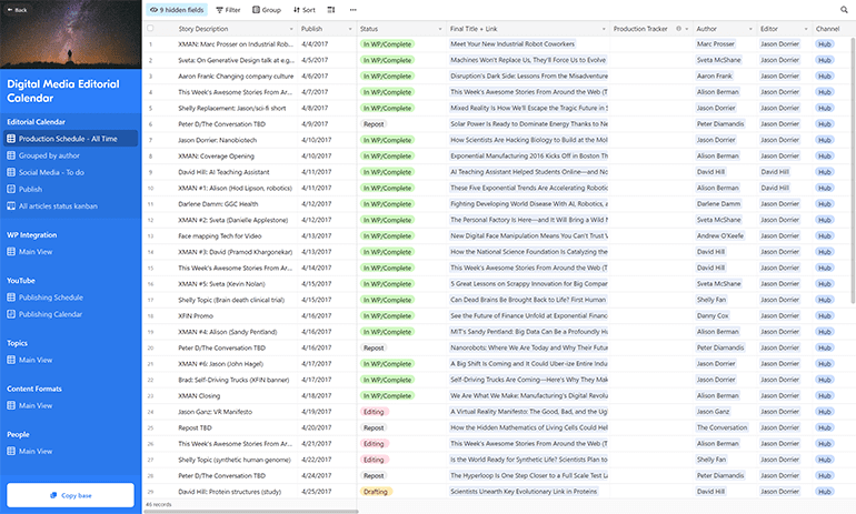 Airtable oferuje kalendarz do pobrania, który wygląda jak prosty arkusz kalkulacyjny i posiada niestandardowe pola na docelowe słowa kluczowe. Widok listy może być mniej przytłaczający niż tablica KanBan dla niektórych.