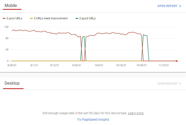 Jednak niektóre adresy URL mogą zostać pominięte w tym raporcie z powodu braku wystarczających danych do raportowania. Dzieje się tak, gdy Twoja strona jest zupełnie nowa lub ma niewiele stron docelowych.