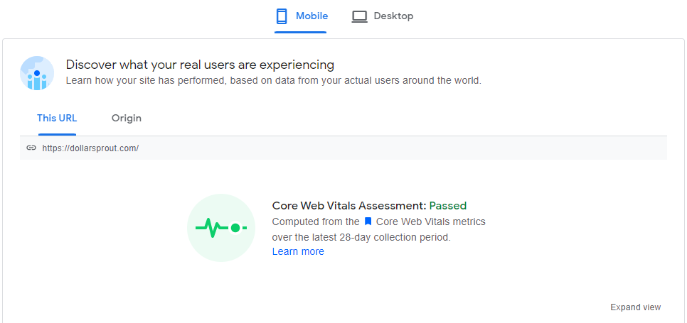 Teraz narzędzie wyświetli wynik Core Web Vitals zarówno dla komputerów stacjonarnych, jak i urządzeń mobilnych, jak pokazano na poniższym obrazie.