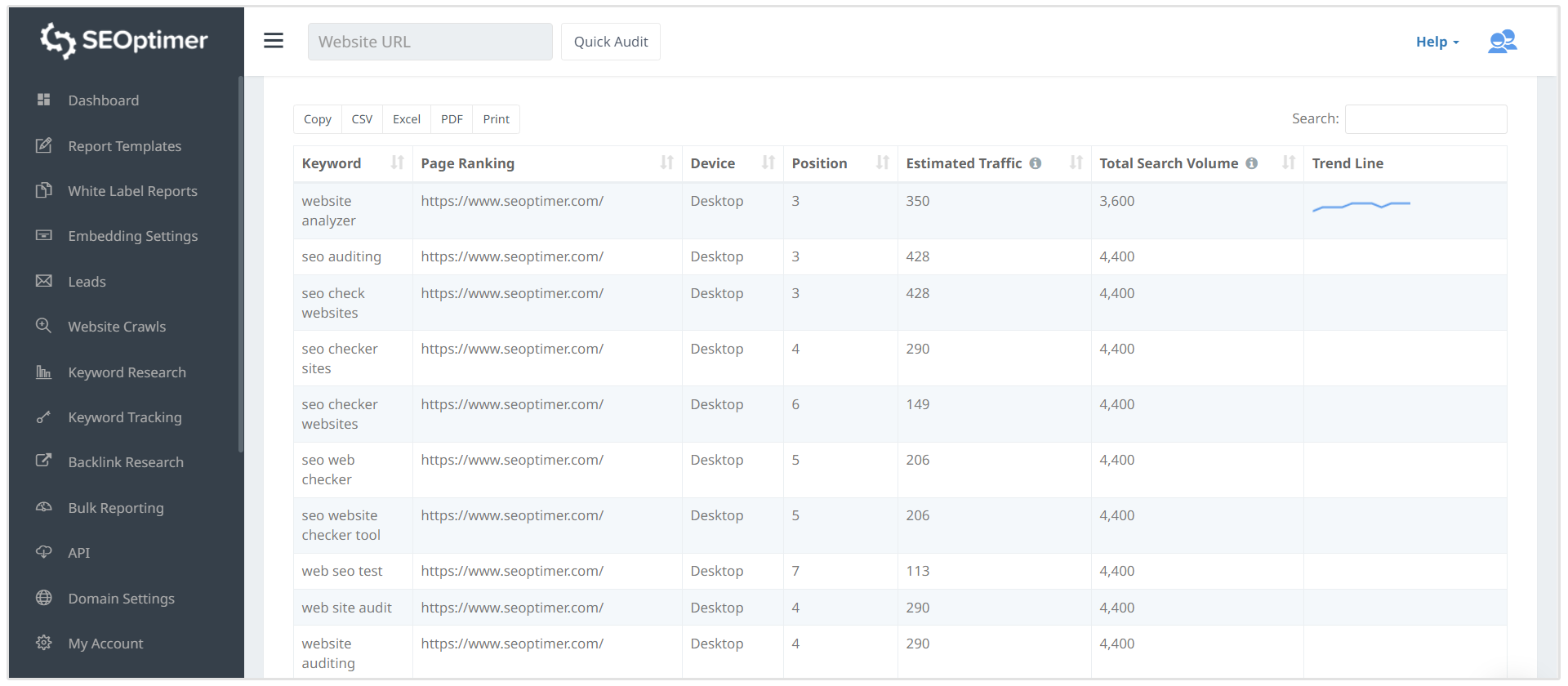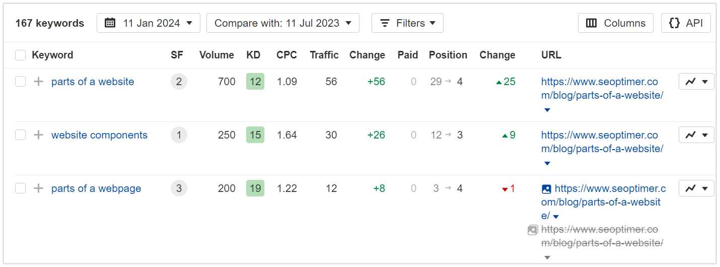 Możesz również użyć narzędzia do śledzenia słów kluczowych, aby monitorować organiczne pozycje i znaleźć artykuły, które nie osiągają swojego prawdziwego potencjału w rankingu.