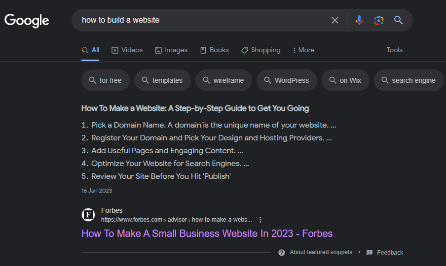 Tutaj możemy zobaczyć, że Wyróżniony Fragment dla zapytania wyszukiwania „jak stworzyć stronę internetową” pokazuje artykuł z Forbes przedstawiający kroki, które musisz podjąć.
