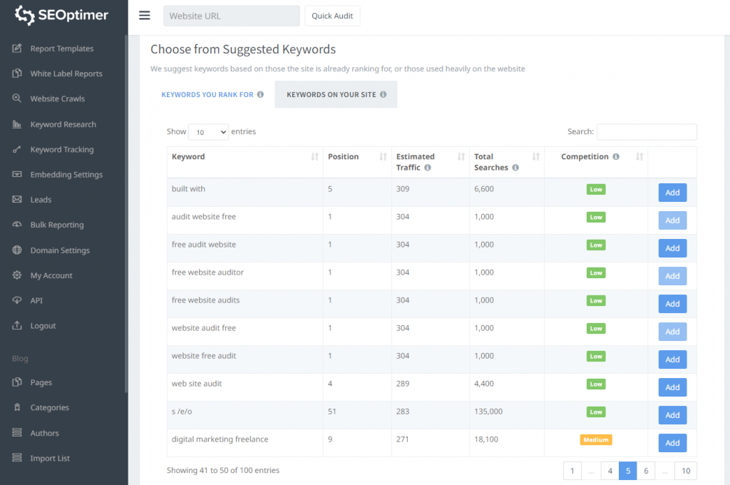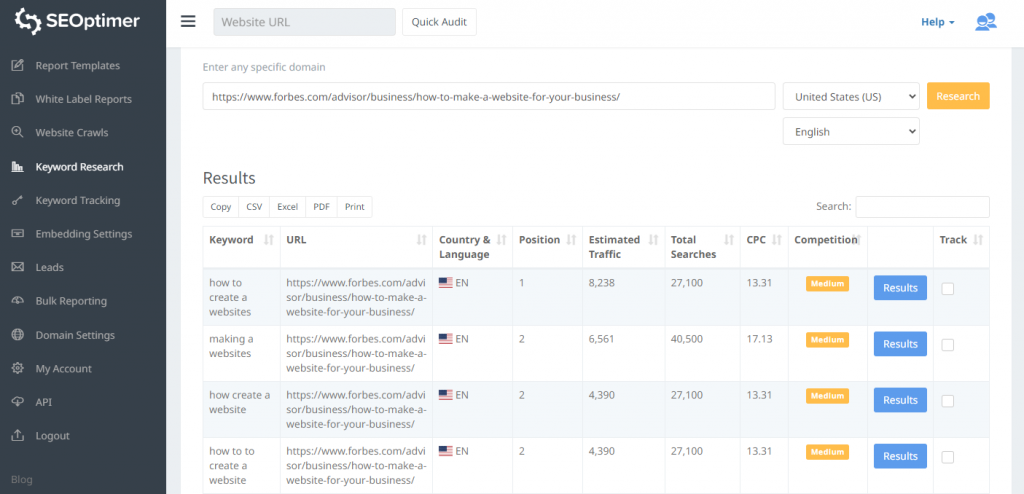 Następnie przeanalizuj słowa kluczowe, których używa i dla których obecny wynik jest wyświetlany w Featured Snippet. Aby to ułatwić, możesz użyć narzędzia do badania słów kluczowych SEOptimer’s narzędzie do badania słów kluczowych aby wprowadzić URL strony, która się rankinguje.