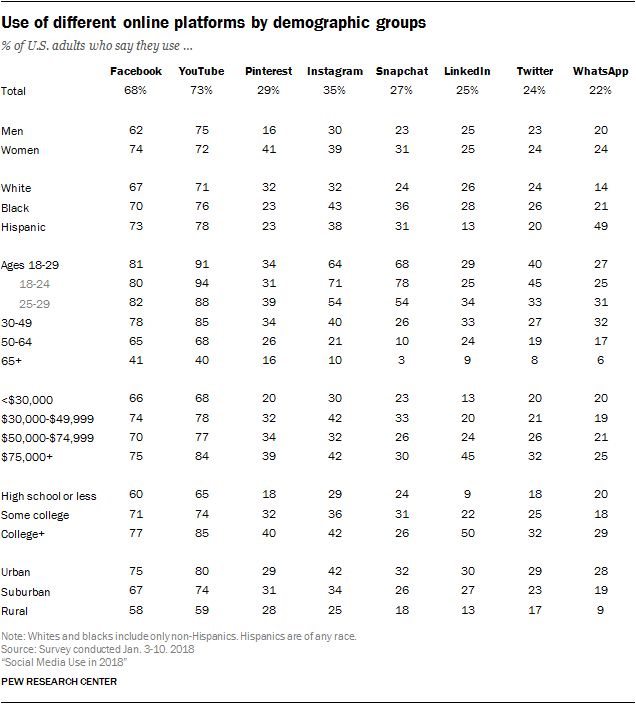 Strony mediów społecznościowych to nie tylko darmowe narzędzia. Jeśli masz na to budżet, możesz również rozważyć przeprowadzenie ukierunkowanej kampanii reklamowej w mediach społecznościowych. Wszystkie platformy mediów społecznościowych mają opcje reklamowe, które pozwalają dotrzeć do docelowych odbiorców na podstawie danych związanych z ich demografią i zachowaniem. Jednak zanim rozpoczniesz kampanię reklamową w mediach społecznościowych, lepiej dowiedzieć się, z których stron mediów społecznościowych korzysta Twoja publiczność. Poniżej możesz zobaczyć porównanie Pew Research Center dotyczące użycie mediów społecznościowych w 2018 roku: