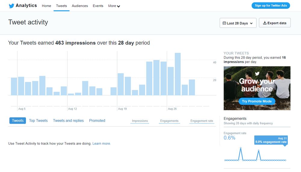 Wybierz kilka kanałów, które dobrze pasują do Twojej publiczności. Nie ma tutaj ogólnej zasady. Wymaga to eksperymentowania, aby dowiedzieć się, co działa dla Twojego biznesu. Zachowaj swój profil na stronie mediów społecznościowych tylko wtedy, gdy generuje on leady i sprzedaż. Istnieją kilka metryk możesz użyć do oceny sukcesu kanału w mediach społecznościowych, takich jak ruch z polecenia, wskaźniki klikalności i zasięg ogólny. Jako przykład, oto jedna ze stron analitycznych Twittera z wyświetleniami i 4-tygodniowym wskaźnikiem zaangażowania.