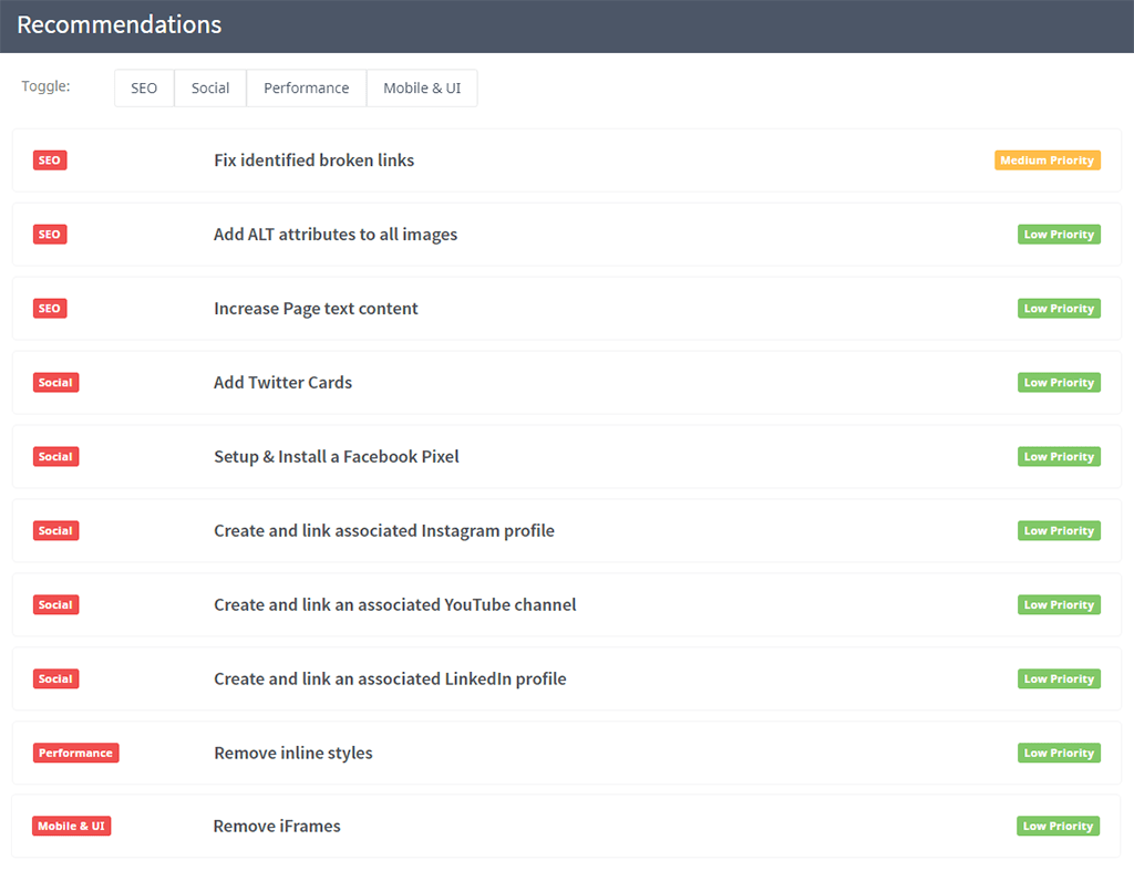 W końcu powinieneś wykorzystać wszystkie powyższe spostrzeżenia, aby sformułować rekomendacje dotyczące tego, jak poprawić wydajność SEO. Grupuj swoje rekomendacje według każdej sekcji raportu i wskaż, które z nich są wysokiego, średniego i niskiego priorytetu. Podczas dyskusji z klientem lub szefem, skup się najpierw na elementach o wysokim priorytecie.