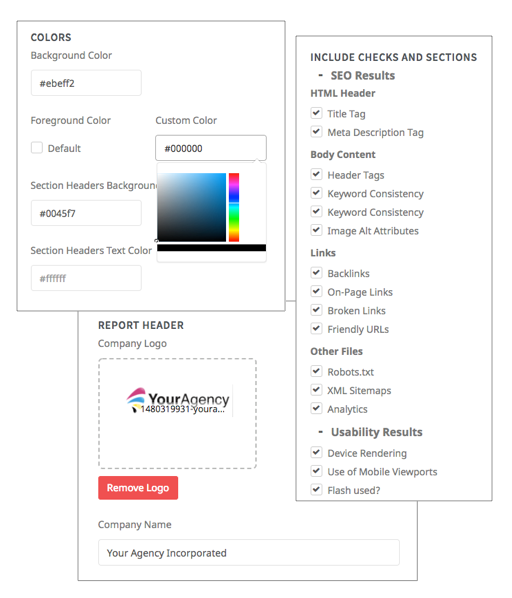 Aby utrzymać silną obecność marki dla twojej agencji, powinieneś opatrzyć wszystkie raporty białą etykietą (nie tylko raporty SEO) i upewnić się, że podstawy takie jak logo, czcionki, kolory i style są zgodne z tożsamością marki twojej agencji.