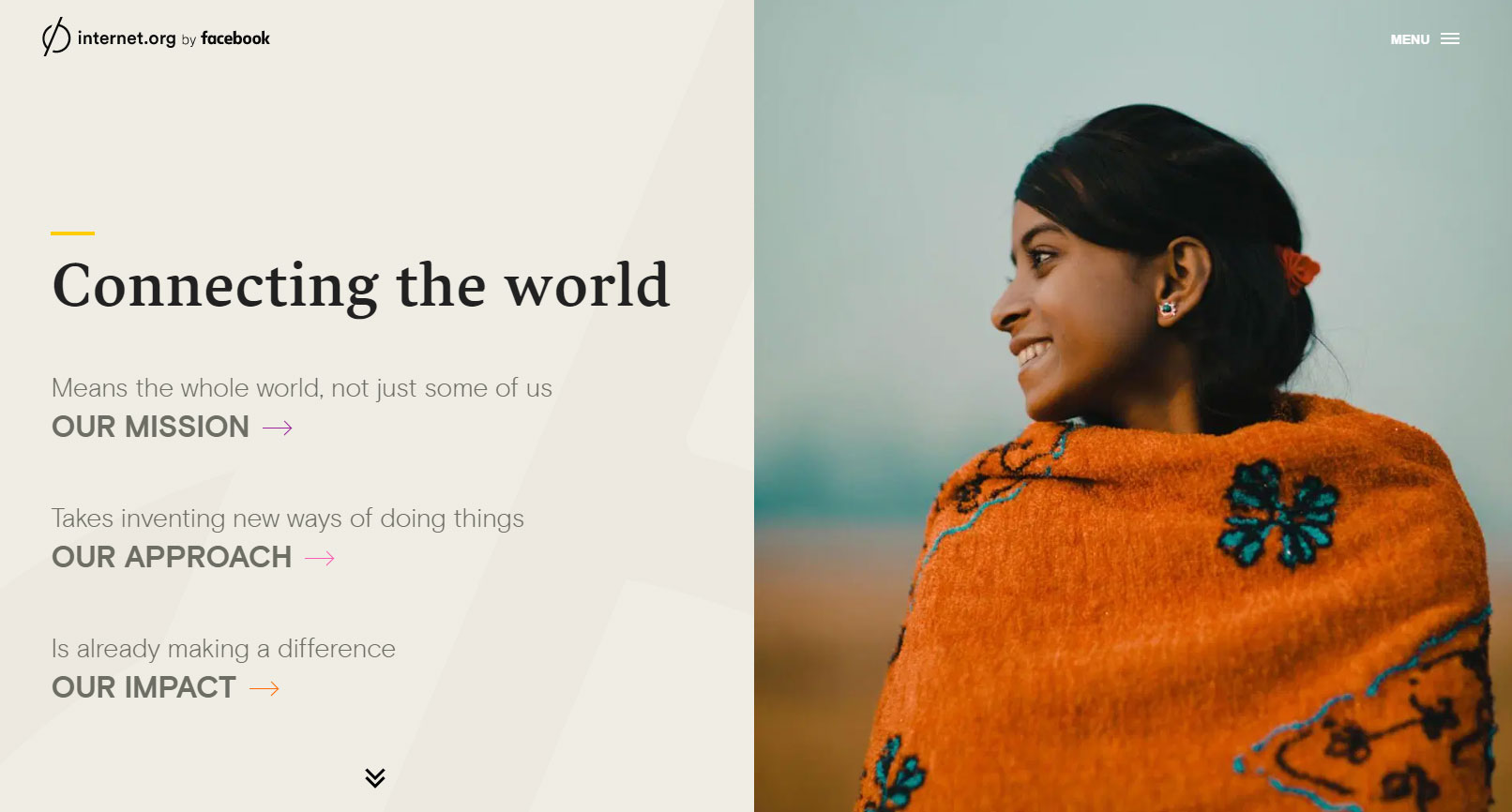 Internet.org to kolejny przykład nagłówka na pełną szerokość z wyciszonym górnym menu nawigacyjnym. Ale zamiast karuzeli wykorzystuje lewą stronę nagłówka jako podwójne menu nawigacyjne i obszar treści. Gdy użytkownik dokona wyboru, strona przesuwa się w lewo, przesuwając obraz bohatera na lewą stronę i odsłaniając treść główną po prawej stronie.