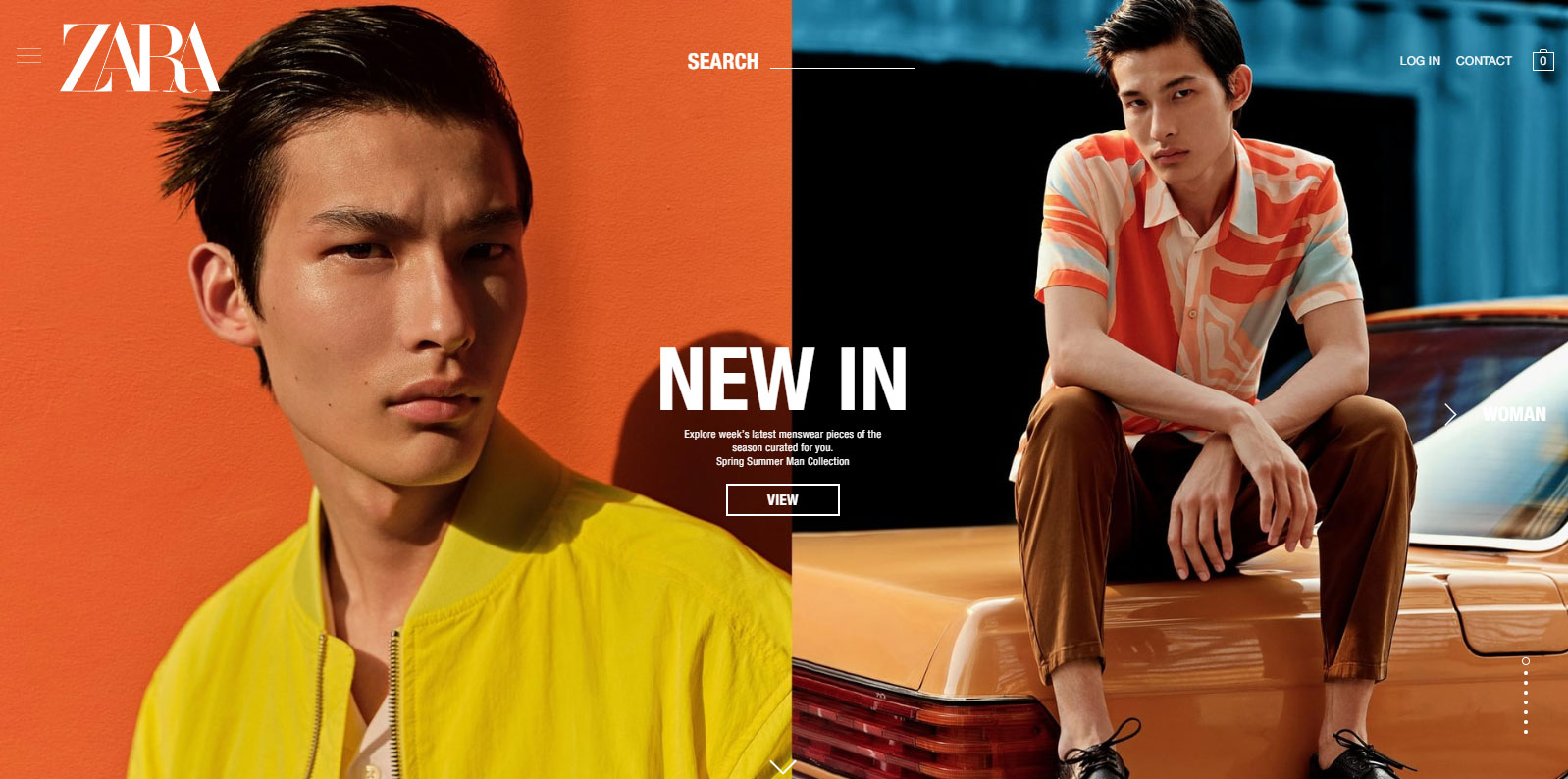 Nagłówek Zara działa niemal jak barykada, wyróżniając karuzelę kolekcji. Wskaźniki karuzeli (kropki) są wyświetlane pionowo w dolnym prawym rogu, podczas gdy nagłówek wypełnia ekran w 100% z nałożoną nawigacją na górze. To uderzający wygląd.