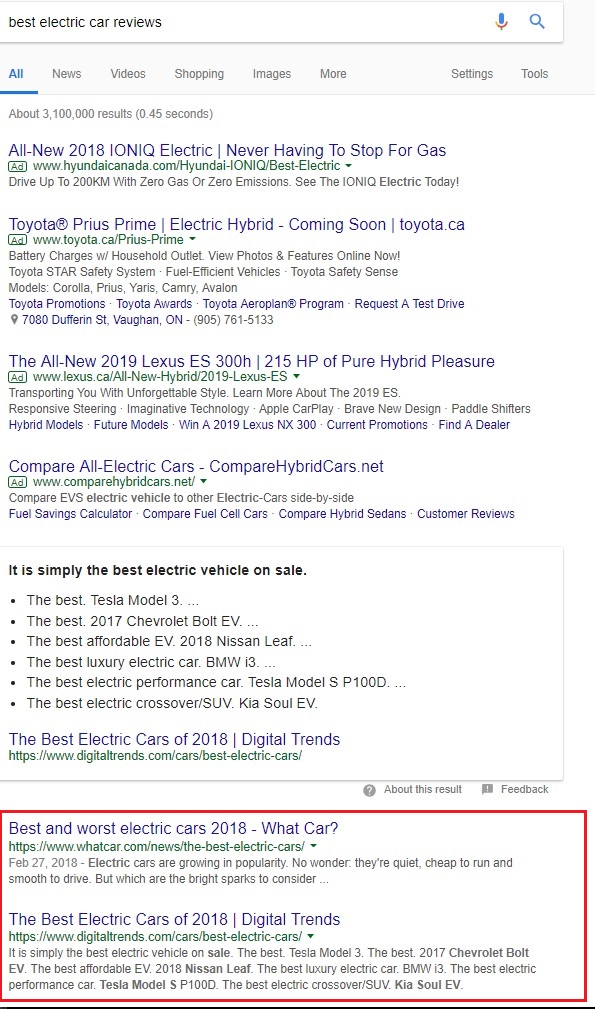 Na przykład, jeśli wpiszesz w Google wyszukiwanie takie jak "najlepsze recenzje elektrycznych samochodów", kto pojawia się na szczycie organicznych wyników wyszukiwania?