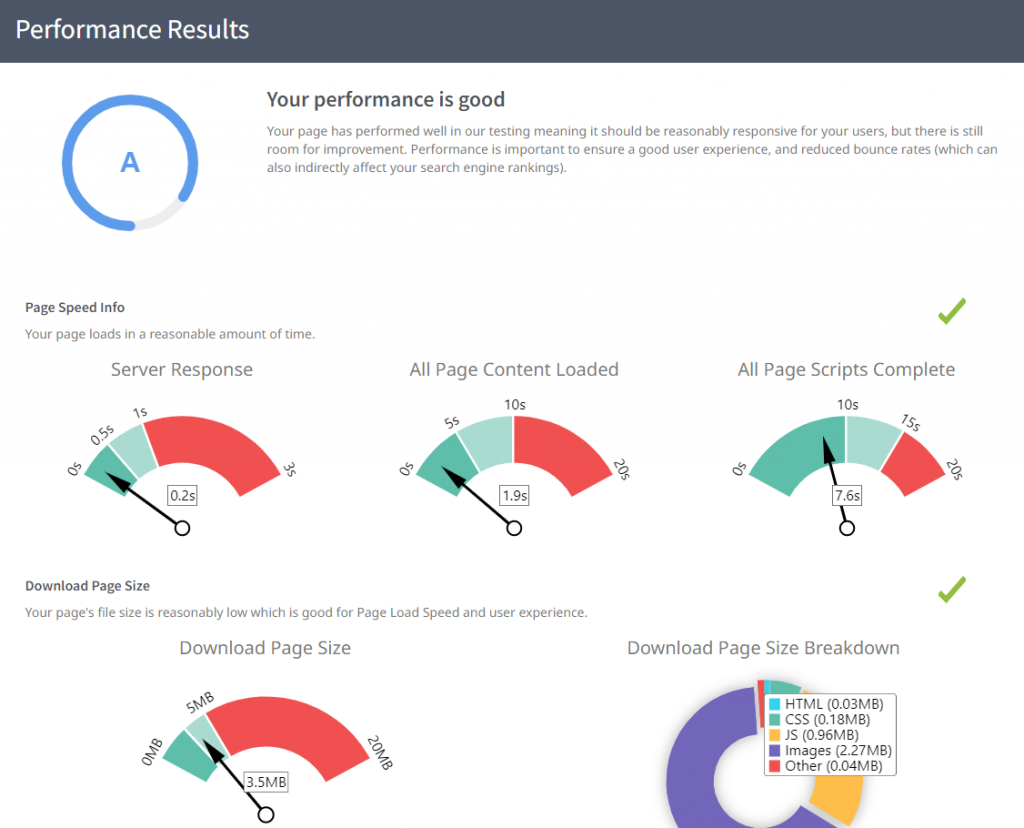 Raport audytu strony internetowej SEOptimer zawiera również przydatne informacje na temat szybkości ładowania Twojej strony, całkowitego rozmiaru strony internetowej oraz innych kluczowych czynników wpływających na szybkość ładowania Twojej strony.
